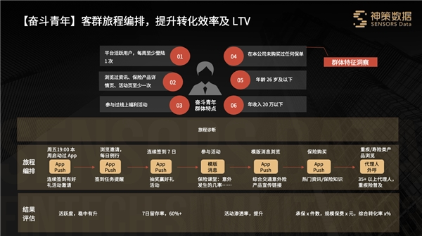 领先保险公司在针对不同客群进行数字化运营时发现,差异化客群洞察是客户旅程编排的必要环节,因此应针对不同客群策划个性化的营销策略,以提升转化效率和 LTV。比如,通过差异化客群洞察发现,奋斗青年群体在客户旅程中处于「产生兴趣,尝试参与线上互动」的阶段,考虑到其购买能力和购买偏好,该险企以自动化运营为主,适度进行客户行为牵引,提升客户留存与活跃度。