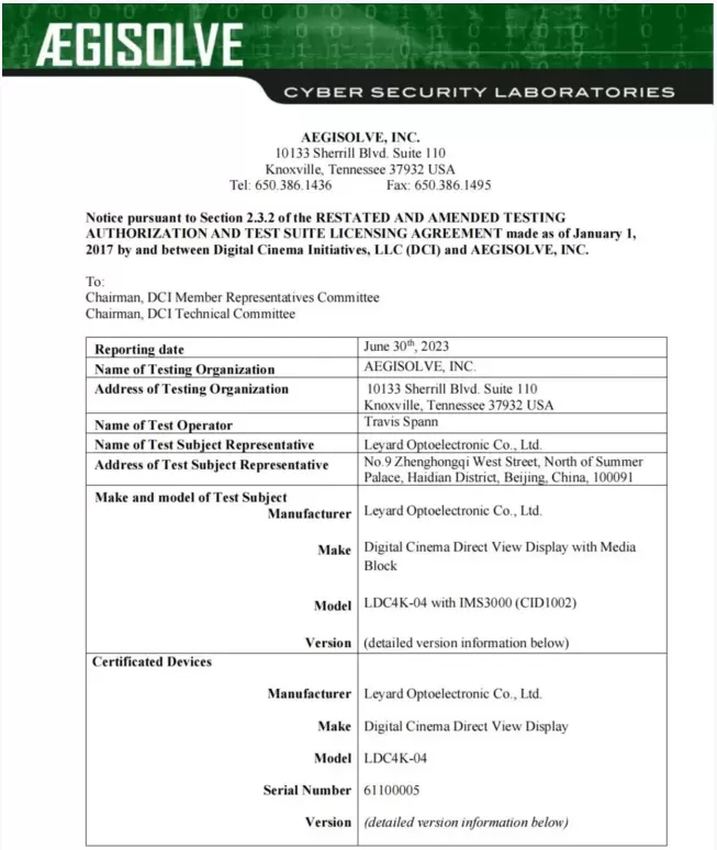 DCI即美国好莱坞数字影院倡导组织是目前国际通用的数字影院系统认证标准。所有要进入影院的数字电影系统和产品,都必须先经过DCI的认证。早在2022年10月,利亚德拥有完全自主知识产权的LED电影屏获得DCI认证。此外,2019年11月,利亚德与LG电子联合开发的LG LED Cinema (p3.3mm, 4K)显示屏通过DCI认证。利亚德以强劲的技术实力,全面推动LED电影屏实现全尺寸、全间距、全球覆盖,引领LED电影屏加速走进数字院线。