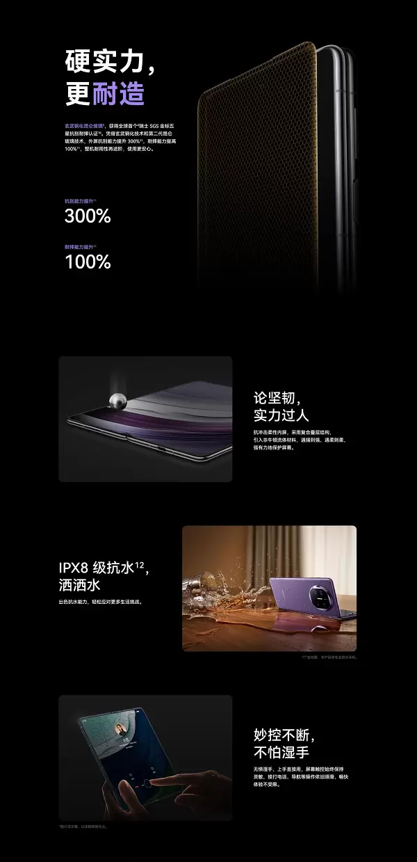 作为一款标杆级产品,华为Mate X5的可靠性领先行业,是一款真正意义上“全面可靠”的折叠屏手机。据华为官方产品资料显示,此款新品的外屏采用了全新玄武钢化昆仑玻璃、内屏使用抗冲击非牛顿流体材料、并使用创新双旋水滴铰链、支持 IPX8 级抗水和全新升级的湿手触控体验。多项创新技术的加持,华为Mate X5的可靠性持续引领行业。