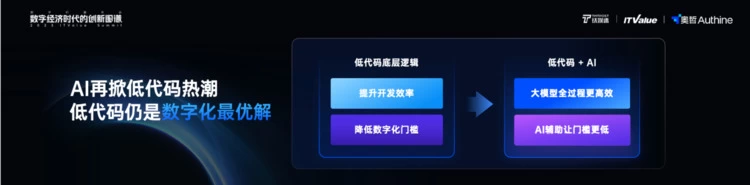 低代码跟AI结合之后,其存在的两个底层逻辑实际上是被加强。所以,我们说AI再一次掀起了低代码热潮。低代码仍是企业数字化的核心引擎,AI在进一步加速它的发展。