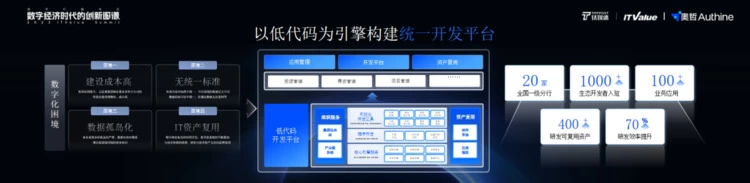 针对这些问题,这家银行以低代码为引擎,构建了一个统一的开发平台,打通跨应用、跨组织的统一资产流通通道,目前已有1000余位生态开发者入驻,打造了100余个业务应用并覆盖全国20家分行,同时沉淀了400余个研发可复用资产,它包含了200余个前端组件、100余个内部的常用公共服务,100余个可以在各分行推广的应用模板。据他们统计评估,研发效率至少提升了70%