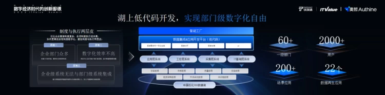 最后一个案例,我们来看一家中国石化旗下的头部炼化企业。他们面临的困境:第一,企业部门众多,各部门专业性强,都有各自的管理体系;第二,数字化效率不高,信息中心无法为每个部门建系统,成本和速度都是问题;第三,企业级系统无法与部门级系统集成,部门系统建设希望能在架构与企业级系统之上,但又不能影响企业级系统。