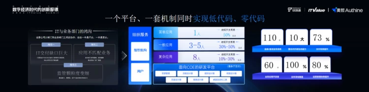 他们通过低代码构建了一套业务驱动的应用开发平台,再加上一套COE机制,同时解决了简单、普通和复杂应用的需求。对于简单应用,部门的业务人员可以直接基于平台进行搭建,如用车、食堂管理等应用;对于普通应用,如一些部门级业务系统,先由业务人员进行构建,再跟COE的开发人员进行联动解决;而复杂的系统,就交给COE团队。