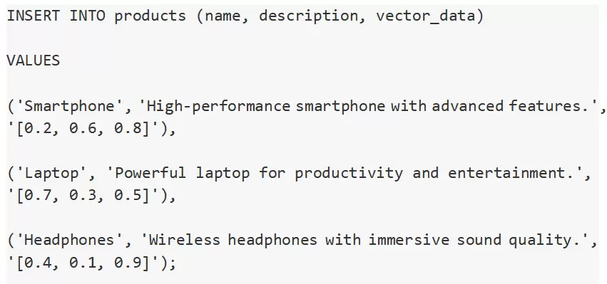 3.向商品表中插入一些商品数据,包括商品名称、描述以及与其相关的特征向量。
