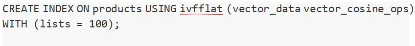 ●WITH (lists = 100): "lists" 参数设置为 100,是为了控制索引中的列表数量,以便在向量搜索时进行更有效的查询。