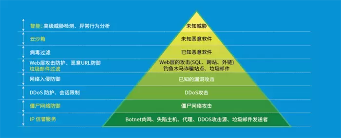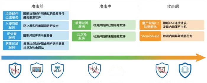 产品能够通过入侵防御服务、IP信誉服务和病毒过滤服务,可以在攻击发生前精准识别网络攻击、恶意软件、风险IP等攻击流量并及时进行阻断;通过病毒过滤服务有效发现攻击过程中的已知威胁;攻击发生后,通过僵尸网络 C2 防御服务能够有效发现内网受感染的僵尸肉鸡,防止僵尸网络进一步破坏企业内网。从已知威胁、到未知威胁,全方位为客户提供运营安全保障。