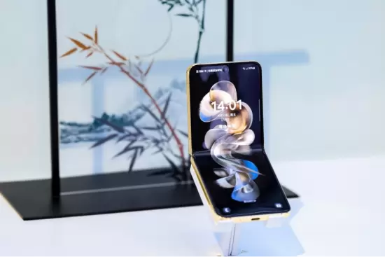 以精致机身承载优雅风范,心系天下三星W24 Flip轻盈开合之间,尽显独特的优雅动感。冰瓷白陶瓷背板兼具经久不衰的美学视效与工艺品级的温润触感,折叠状态下仿佛一枚珍贵宝盒,自然流露高贵雅致。采用奢华金配色的边框与铰链盖勾勒出机身轮廓,铰链处精心设计的宝石状方格赋予机身未来派外观,伴随持有者的举手投足呈现珠宝般流光婉转,闪耀夺目光华。展开机身,富有电影感的“心系天下”Logo动效,尽显简约大气的高级感。潇洒飘逸的“浮生若梦”动态壁纸,将金玉材质与丝绸肌理调和出独特美感,以温婉线条与曲面形态寓意生命的多维百态,豪情纵横之余,更添几分不羁与洒脱。