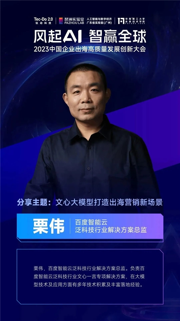 百度智能云泛科技行业解决方案总监栗伟确认出席大会。大会现场,他将以《文心大模型打造出海营销新场景》为主题,结合百度在AIGC技术上的实际应用,带来基于实战经验的真知灼见,指路技术落地的可能性。