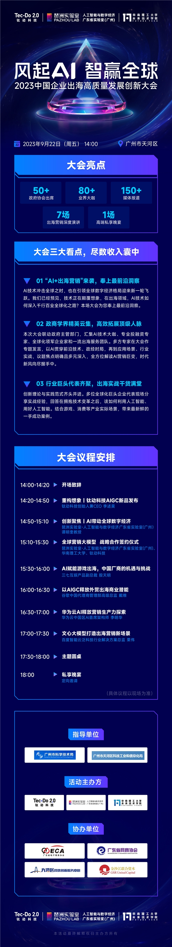 9月22日,由广州市科学技术局和广州市天河区科技工业和信息化局指导,钛动科技联合琶洲实验室-人工智能与数字经济广东省实验室(广州)和华南理工大学未来技术学院共同举办的“2023中国企业出海高质量发展创新大会”将正式拉开帷幕。大会集结政界、学界和商界多方精英,共话AI风潮下我们该如何以技术重塑营销新业态,共创中国企业的“走出去”新范式,共迎全球化高质量发展。