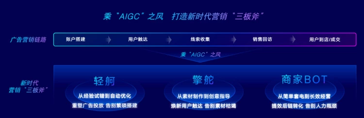 百度推出的首个AIGC教育行业营销解决方案中,三板斧“轻舸”、“擎舵”、“商家bot”的巧妙结合,切实有效为教育行业广告营销降本增效。三大产品基于生成式AI能力,全面覆盖教育行业营销全链路。“轻舸”以自然语言交互,重构营销表达,告别复杂创编;“擎舵”聚焦用户触达环节,只需要简单的创意指导输入,就可以批量制作出精美的创意素材,焕新用户触达,告别素材枯竭;而“商家bot”则覆盖从线索获取到到店的后链路,帮助商家更高效的在百度经营,告别人力上的瓶颈。
