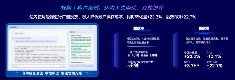 达内作为全球最大的IT教育集团,在使用“轻舸”平台后,一条广告的创编时间,从原来的2小时,缩短至3分钟,极大释放了人力成本;自然语言的交流,让系统更好地理解了达内的推广诉求,更快更准找到目标用户,投放的转化量提升了23.3%,广告ROI提升了22.7%;另一个教育客户十方在使用“擎舵”后,客户整体素材产出能力提升了2倍,为信息流扩量奠定了基础。