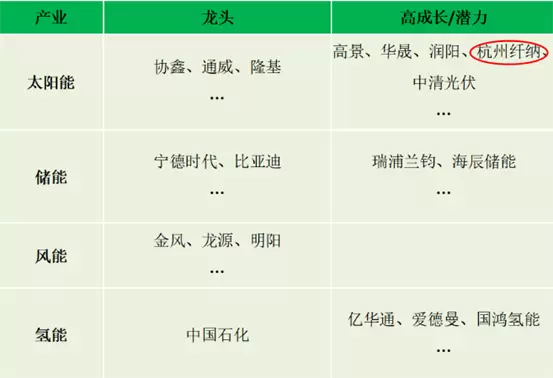 主要新能源产业中,中国龙头、高成长/潜力企业(部分)