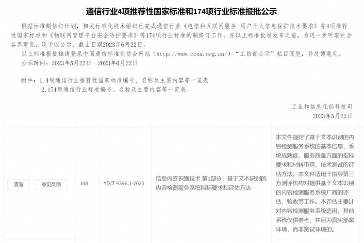 近日,中华人民共和国工业和信息化部发布 2023 年第 17 号公告,正式批准 166 项通信行业标准,其中由网易智企旗下,网易易盾牵头编写的《信息内容识别技术 第 1 部分:基于文本识别的内容检测服务系统指标要求和评估方法》行业标准正式获批,标志着易盾在行业顶层设计里的卓越能力,也体现了易盾在数字内容风控领域内不可撼动的技术领军者地位。