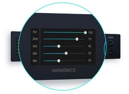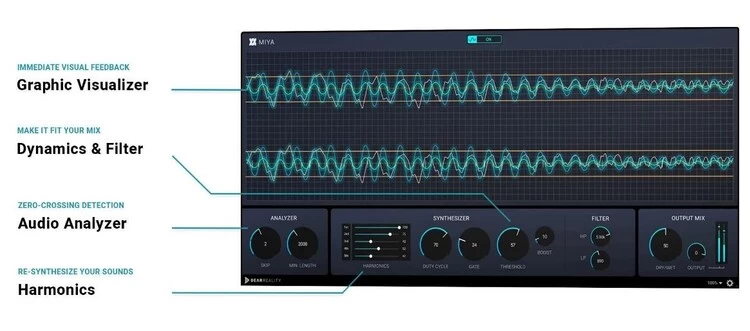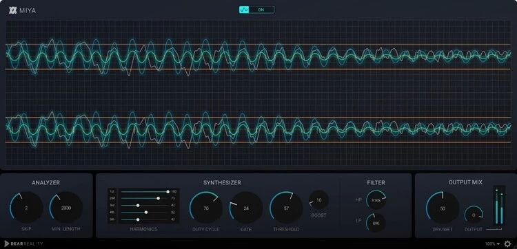 通过MIYA, 用户可以任意调节音频,从醇厚有质感的音效到颇有粗粝感的干扰音效:在分析器(Analyzer)部分中,用户可以定义小波形长度,并弃用检测到的零点交叉位置,从而形成独具特色的共鸣——小波形越长,合成音调就越低。生成的信号可以分别进行调整,五个谐波(Harmonics)滑块可创建从1 st到5th的各种谐波。