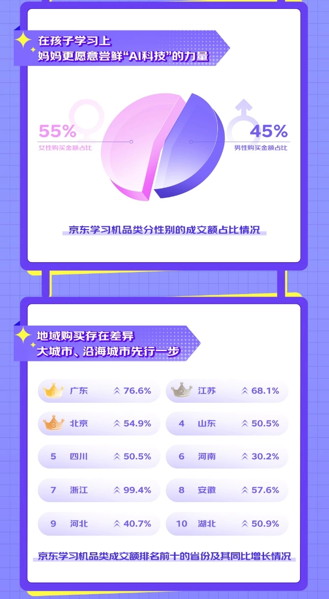 《图鉴》也指出,在孩子学习问题上,妈妈对“AI新科技”有着更高关注度,更愿意尝鲜体验,购买AI家教机产品的用户中,女性占55%,男性占45%。而不同区域的家长对AI家教机的关注度也有所差异,京东数据显示,浙江、广东、江苏等大城市和沿海地区AI家教机的渗透率和增长高于四川、北京、湖北等地,“教育大省”在家庭教育尝新上先行一步。