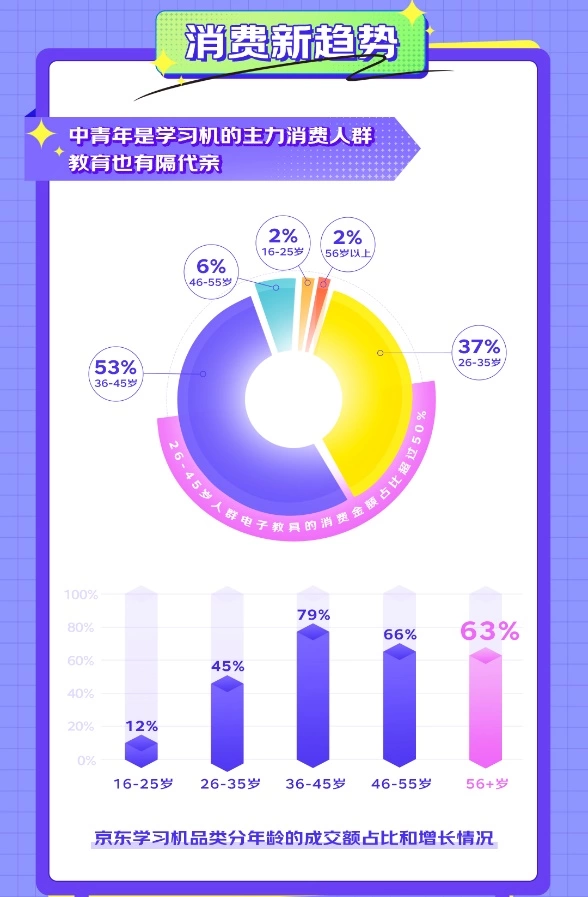 同时,《图鉴》也反映出一个有趣现象,爷爷奶奶、外公外婆等长辈与孩子之间产生的“隔辈亲”现象不仅体现在日常生活中,在家庭教育中也表现明显。数据显示,56岁以上的长辈消费增速超过63%,给孙辈购买学习机的意识显著增强。