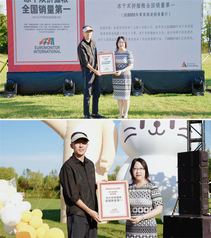 9月14日,中国宠物行业冻干猫粮趋势发布会暨E76猫粮换新盛典在山东省临沂市举行,现场由来自欧睿国际-中国区高级咨询总裁穆女士为阿飞和巴弟颁发冻干猫粮全国销量第一的认证书,并就宠物食品行业标准规范和应用现状展开深度探讨,来自行业协会、科研院校、全球供应链合作伙伴、媒体机构和资深用户等共同见证了这一聚焦宠物营养健康知识的科学表达和传播普及的盛事。