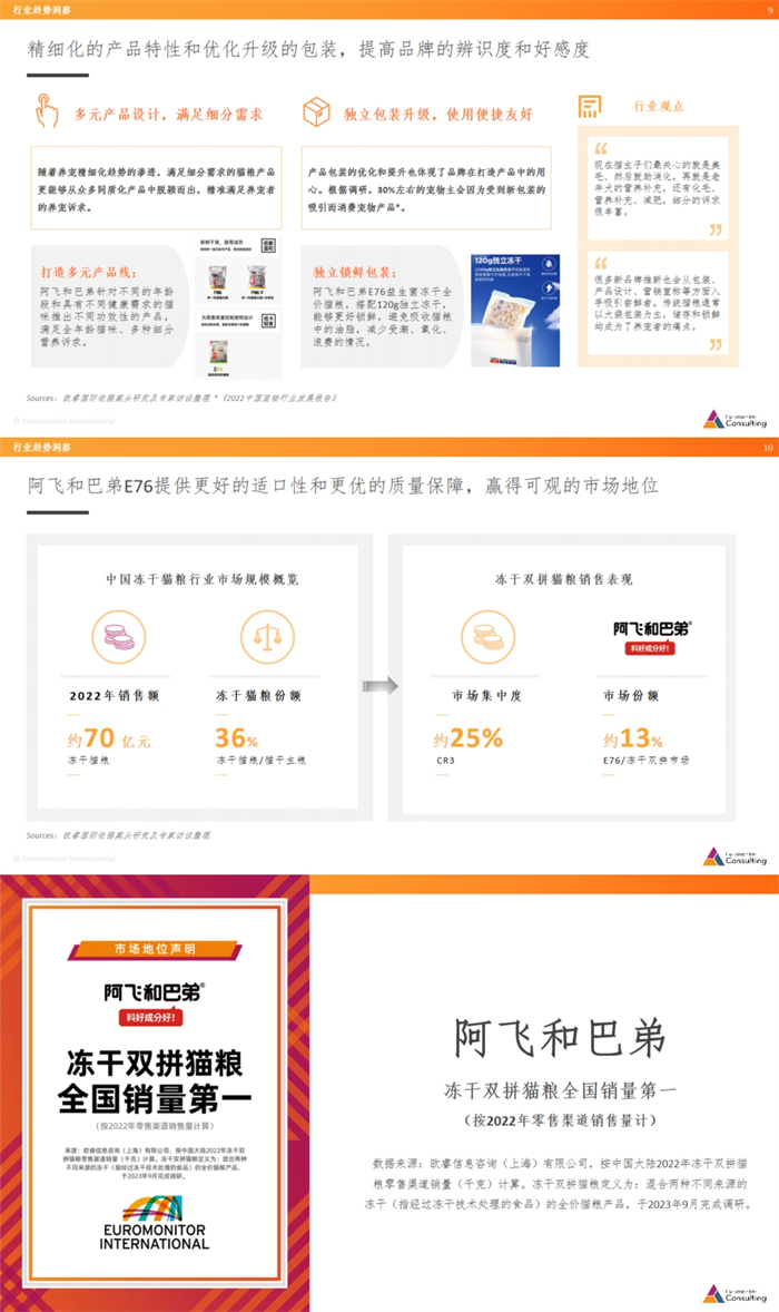 虽然冻干猫粮市场品牌众多,行业竞争激烈,阿飞和巴弟的冻干猫粮产品还是凭借其过硬的产品实力,成功获得了消费者的认可。根据全球知名的商业信息提供商欧睿国际的调研结果,阿飞和巴弟荣获冻干双拼猫粮全国销量第一(按2022年零售渠道销售量计)的市场地位。这款历时无数个日夜研发出的好产品,值得更多人认识。