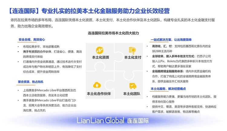 依托在新兴市场的多年布局,连连国际(LianLian Global,连连数字旗下品牌)凭借本土化资质、本土化支付、本土化合作伙伴及本土化团队,构建专业扎实的本土化金融支付及生态服务,助力出海企业稳健经营、长效增长。