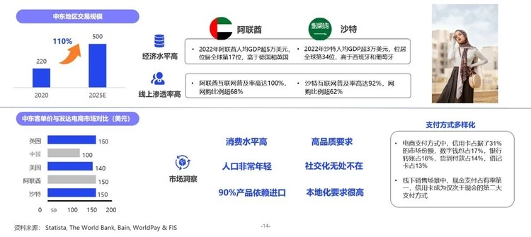 预计2025年,中东电商市场交易规模将从2020年的220亿美元增长至500亿美元,增长率高110%。沙特和阿联酋是该地区最大、增长最快的电商市场,购买力强劲且消费水平高。同时,支付和物流环节是制约电商发展的主要痛点,需要本地化的服务快速响应市场需求。