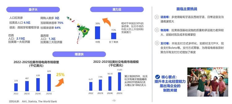 得益于拉美地区网购人口及消费需求双高,2022年至2025年,拉美电商市场容量将从3780亿美元增长至8290亿美元的规模,保持25%的增长速度。面对拉美市场语言难、物流难及支付难等经营痛点,深入本地化、提升本土化能力是跨境企业的制胜之道。