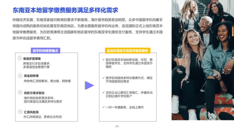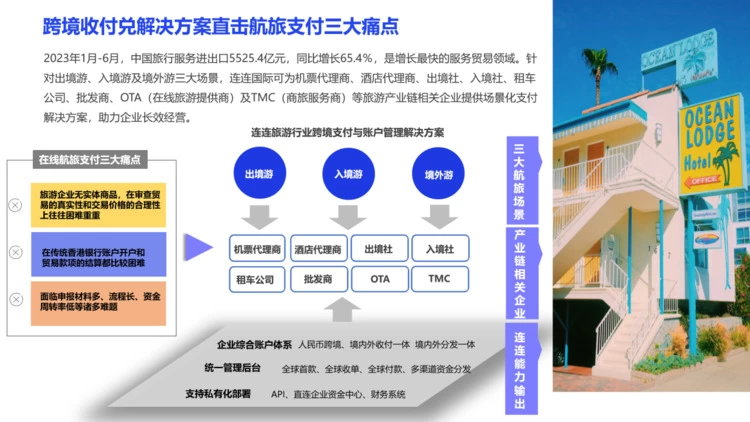 顺应服贸出海数字化发展趋势,2022年连连国际正式上线服务贸易行业解决方案,即依托发展成熟的跨境全链路收付兑能力和境内外双边持牌资质,围绕产业链上下游支付及复杂资金处理场景,为国际物流、旅游行业、留学教育、服务佣金、薪资分发、技术服务、跨境医疗等不同出海行业的客户提供安全合规、高效低成本的支付解决方案,帮助客户降本增效,破解跨境服务贸易支付难题。