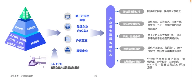 在新兴市场货物贸易及服务贸易并举发展的背景下,便捷高效的跨境支付与资金管理需求猛增。据亿邦智库调研,出海企业对跨境金融服务的受关注度高达34.19%。以数字技术及消费场景洞察为驱动,跨境金融服务机构基于出海企业多主体、多市场、多场景、多币种、多维度的服务需求,围绕本土客户需求进行产品创新,协同生态伙伴持续提升服务品质和客户体验,构建产业级金融服务新生态