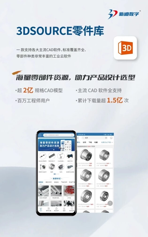 3DSOURCE零件库由上海新迪数字技术有限公司自主研发,作为国内领先、用户规模庞大的3D零部件资源一站式服务平台,3DSOURCE零件库历经十年技术积累和用户沉淀,为制造企业、工业零部件品牌商建立精确连接,打造快速设计选型、快速询盘采购、供方精准营销的工业零部件数字化营销新模式。