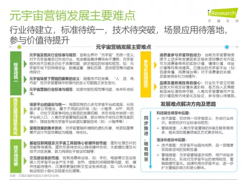 报告指出,元宇宙营销发展主要难点,包括行业待建立,标准待统一,技术待突破,场景应用待落地,参与价值待提升。