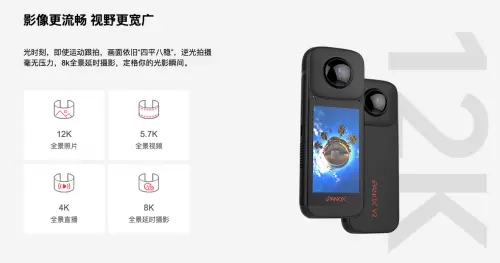 全景时光Pano X V2前后搭载两颗F2.0鱼眼镜头,轻松取景。7200万像素pro级全景影像,支持12k全景照片,画质清晰可见,5.7k30帧高清全景影像,经得起考验。8k全景延时摄影,一键浓缩时光踪迹,成片更精彩。云端相册,随时随地想拍就拍,珍藏属于你的每一个精彩瞬间。8-bit色彩与12k的分辨率的搭配,低光性能表现更亮眼,色彩搭配更出众。