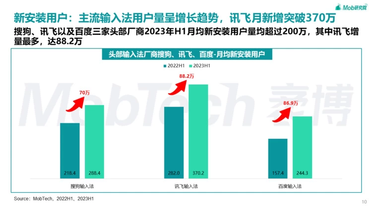《2023年中国第三方输入法行业洞察》是一份由知名数据研究机构Mob(袤博)发布的行业报告。截至2023年6月,中国第三方输入法活跃用户规模维持在8亿左右,搜狗、讯飞、百度目前保持行业TOP3,呈现“三分天下”的局面。数据显示,头部厂商的月新安装用户量均超过200万,第三方输入法用户留存率峰值整体呈增长态势。