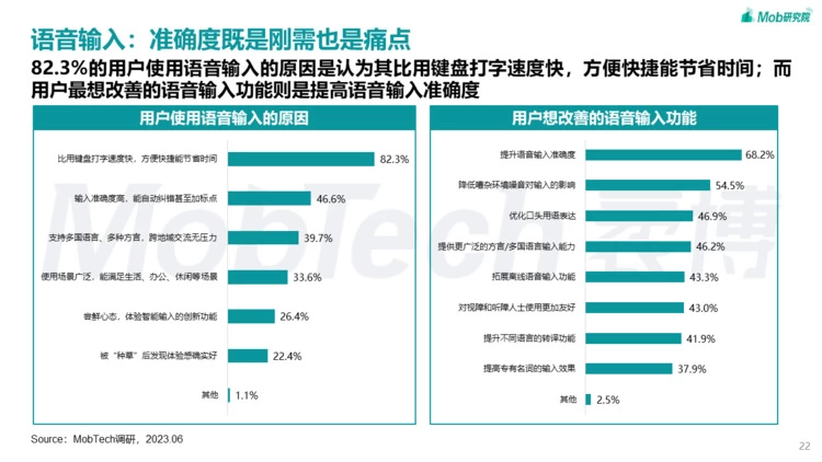 调研结果显示,82.3%的用户使用语音输入的原因是认为比键盘打字快,方便快捷能节省时间。事实上,语音输入作为输入法标配,其功能已相当成熟。例如讯飞输入法支持方言免切换语音输入,可以自由地录入文字,在不方便用手打字时提供便捷输入;在大量录入文本时,往往能减轻用户疲劳感;在打游戏等需要动手场景下,语音输入可以通过智能转换文字完成交流。因此,语音输入在生活场景中的使用率很高。