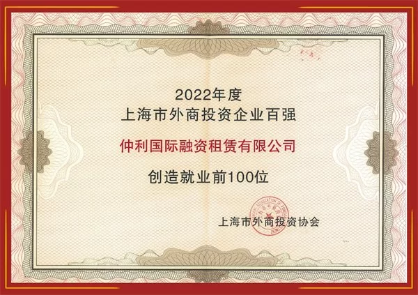 9月14日下午,《2022年度上海市外商投资企业百强报告》发布, 共计255家外商投资企业入围上海市外商投资企业营业收入、进出口总额、纳税贡献、创造就业四项百强榜单。仲利国际融资租赁有限公司凭借2022年的优异业绩表现以及良好发展韧性,蝉联“2022年度上海市外商投资企业纳税贡献百强”及“2022年上海市外商投资企业创造就业百强”的奖项。