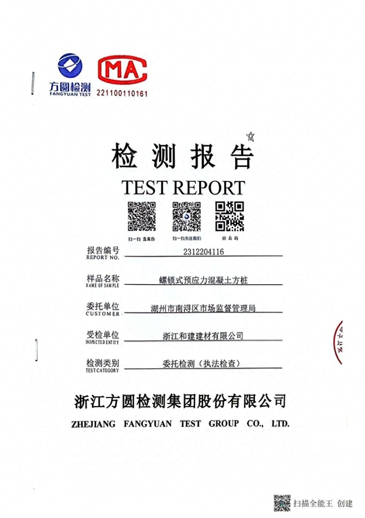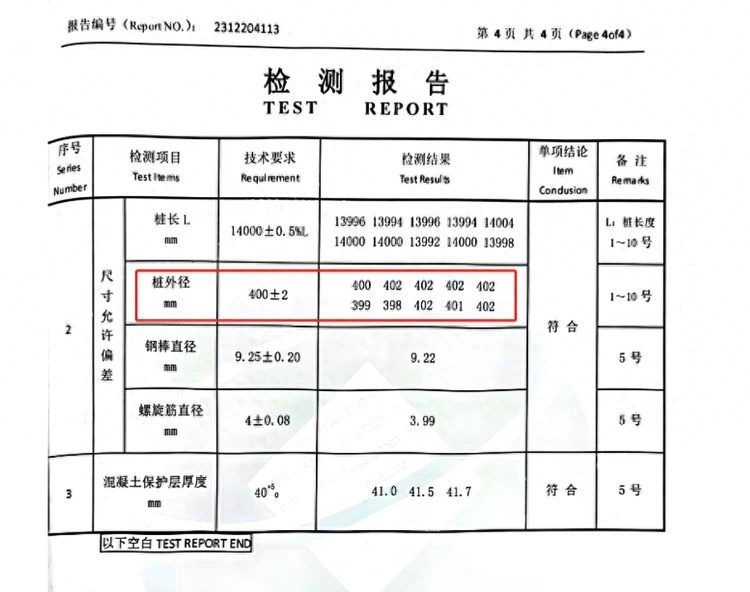 检测产品包含:AB350-310-8米、B350-310-8米、AB400-360-14米、AB400-360-8米、B400-360-15米、C400-360-15米、A450-400-10米、B450-400-13米、A500-450-11米、AB500-450-11米、AB550-480-10米,共计11种桩型,每种规格随机抽取10根进行桩边长及桩身长度检测、破损检测(含钢棒直径、螺旋筋直径、螺旋筋间距、混凝土保护层厚度等等)。