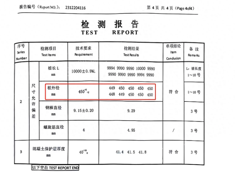 450型桩所有规格,随机检测结果为全部合格(下方展示为A450-400-10米报告截图)。