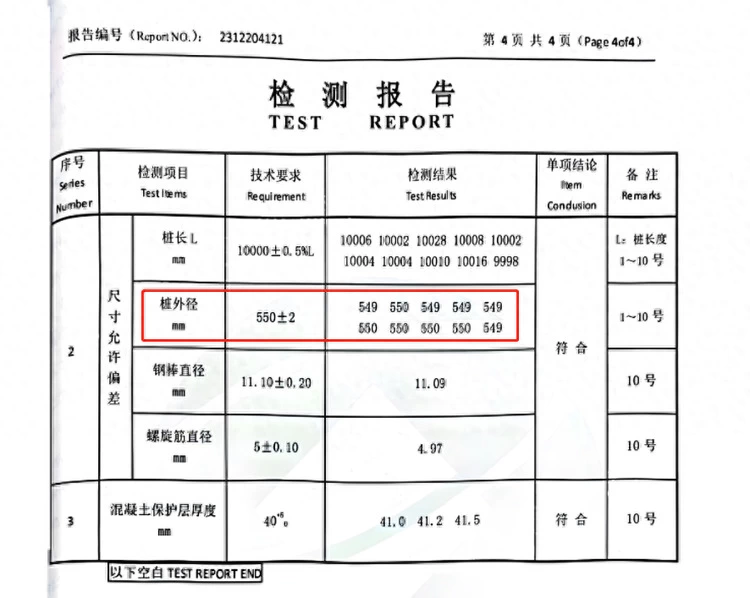 550型桩所有规格,随机检测结果为全部合格(下方展示为AB550-480-10米报告截图)。