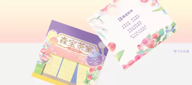 礼盒整体融入森宝原创系列积木花坊的色系,以紫、粉、黄三色为主色调,粉粉嫩嫩的马卡龙色调,搭配治愈系的手绘风格,精准击中受众的少女心,舒适恬淡中又不乏浓浓情意。