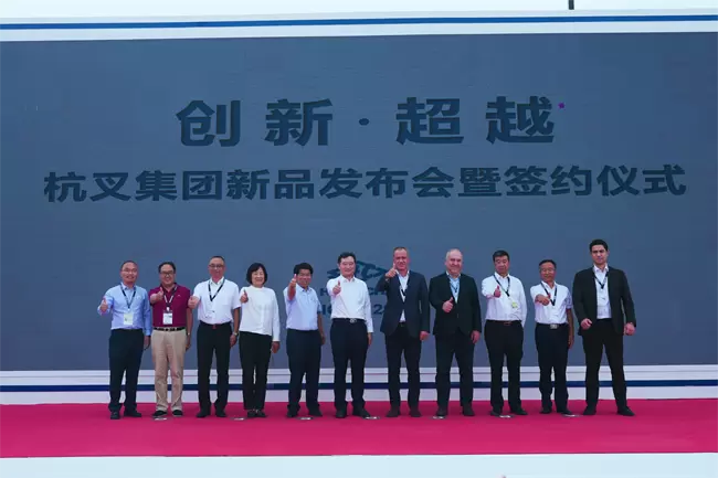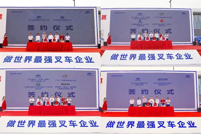 高端的产品、卓越的品质、强大的性能获得了广大客户的认可,各方合作伙伴积极于杭叉集团进行战略合作签约,成就价值,共赢未来。杭叉集团和天津港股份有限公司签订港口用滚装电动叉车设计开发及应用技术研究项目开发协议,致力于推动港口滚装船设备作业环境的应用与推广。杭叉集团和广东广晟氢能有限公司、中集氢能科技(北京)有限公司、天养环保新能源(深圳)有限公司签订氢燃料电池正面吊销售协议及氢燃料电池工业车辆战略合作协议,积极推动氢燃料电池工业车辆的推广,促进我国“绿色港口”的建设,积极开展氢燃料电池工业车辆和氢气供应设备的研发和迭代更新工作,联合制定符合氢燃料电池工业车辆市场化销售和运营的商业模式。全球首台45吨燃料电池正面吊样机现场就被预定,开展当天实现签单总额达上千万元。杭叉集团和中国环境科学研究院大气环境研究所、安瑞科(廊坊)能源装备集成有限公司、广东广晟氢能有限公司签订氢燃料电池工业车辆碳核算合作项目,将为进一步完善我国碳排放交易机制提供有益探索,推动我国工业车辆向绿色、低碳、环保方向发展。杭叉智能科技和湖北普罗格科技签订智能物流解决方案战略合作项目,双方面向智慧园区、智慧仓储、智慧工厂、智慧门店、智慧医疗等应用场景,提供物流集成与总包、物流系统集成、仓储物流自动化设备、精益生产物流及供应链等企业数智化转型一站式解决方案。