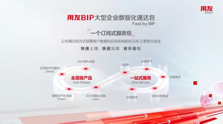 什么是用友Fast by BIP呢?根据官方定义,它以专属云的方式部署,提供客户One Package全层级产品、One Service一站式的服务及整体解决方案,让企业既享受公有云的快捷灵活和专业化保障,又获得专属空间的独立安全和个性化体验,助力大型企业数智化转型快速上线、快速见效、省事、省钱。