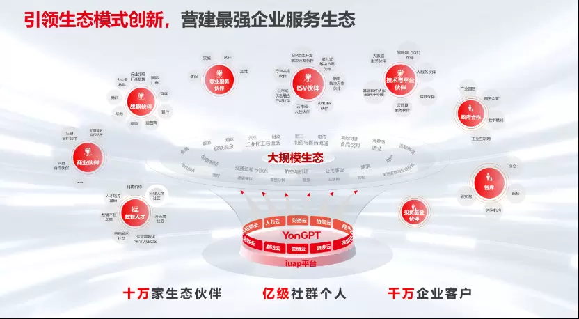 在这方面,用友未来也将持续保持“扩生态”战略定力,坚持长期主义,利用自身技术和客户积累,采取更加灵活务实的商业模式,夯实集成和被集成生态合作基础,高质量发展聚合型生态业务,并通过持续升级生态运营体系和系统支撑平台,持续引领生态模式创新,营建最强企业服务生态,实现“十万生态伙伴、亿级社群个人、服务千万企业客户”的目标。