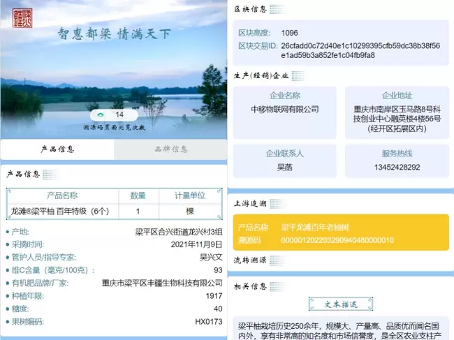 区块链溯源公共平台目前已在重庆、甘肃、福建、广东等多地应用。此外,以此平台为基础形成的工农产品全流程溯源能力已在中国移动能力中台上架。在重庆市梁平区,区块链公共溯源平台联合中国移动重庆公司梁平分公司帮助客户打造“梁山链”地方特色农产品品牌,服务当地商品溯源需求,助力乡村振兴。截至目前累计接入龙滩百年老柚、平川茶叶、富硒大米等50余个商品,溯源码累计使用总量超5000个,溯源产品40余万件,累计扫码次数5万余次,为梁平特色产品宣传及品牌打造工作提供了助力。
