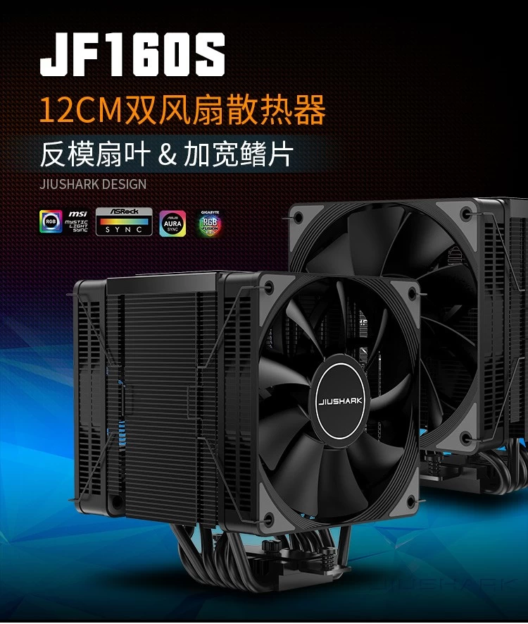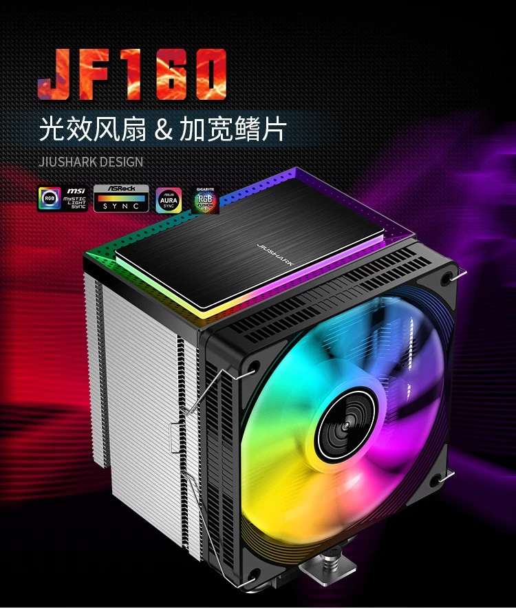 东莞九鲨电子科技有限公司(以下简称“JIUSHARK”)于近日隆重推出一款新的散热器产品。在产品行业中掀起了巨大波澜,这款一经上市就受到了多方关注,这款散热器产品系列2个版本:JF160ARGB版 和JF160S全黑化版,単塔6热管散热器双静音风扇散热效果极佳TDP高达255W,无疑给时下渐趋旺季的散热器市场,带来一股崇尚实力和外观时尚的消费潮流,同时领导了市场散热新潮流。