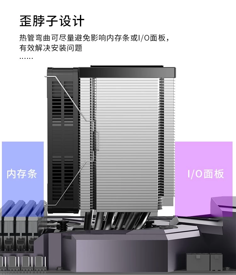 JF160散热器整体尺寸为120mmx107mmx156mm,以黑色作为主打色,采用主动散热模式设计,支持英特尔的LGA115x/1200/1700/2011平台,以及AMD的AM4/AM5平台。搭配的风扇尺寸为120mm x 120mm x 25mm,所采用的动态液压轴承大大有利于降低轴噪,延长散热器的寿命;风扇转速可达800-1800RPM±10%,最大风量28.24-83.04CFM;最大风压为0.36-2.68mmH20;噪声程度为21.23-31.5dBA,产品净重。这款JF160散热器在外观采用歪脖子设计,避免挡到内存条或者I/O面板有效解决安装问题。
