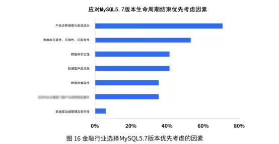 在选择MySQL5.7版本替代时,迁移难度与改造成本是金融企业首要考虑因素。超过70%的企业在选择MySQL5.7替代数据库时会考虑产品迁移难度与改造成本。超五成企业会考虑迁移数据库的可靠性、可用性与可服务性。此外,数据库安全性、兼容性与产品性能也是企业替代时的重要考虑因素。