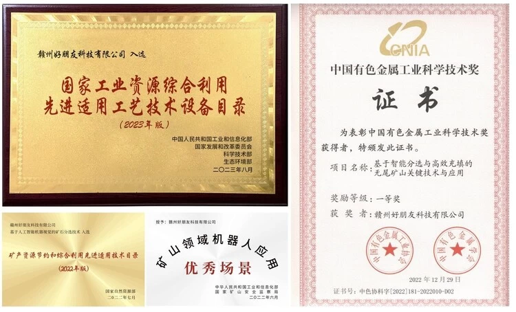 自2015年成立以来,好朋友科技在人工智能选矿领域取得了显著的成就。先后入选了工信部、矿山安监局评选的矿山机器人优秀应用、自然资源部《矿产资源节约和综合利用先进适用技术(2022年版)》、工信部《国家工业资源综合利用先进适用工艺技术设备目录(2023年版)》,并且荣获了中国有色金属工业科学技术奖一等奖、第五届中国先进技术转化大赛铜奖。