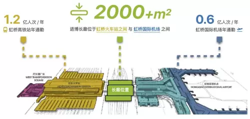 上海虹桥综合交通枢纽作为全球人流最大的综合交通枢纽,进博会期间,是迎来各方宾客最重要的“第一门户”,是进博会重要的窗口和桥梁,“进博长廊”因此也是开放共享、汇聚海内外人士的重要连廊。这条双向双侧的线下展示长廊“画幅”总面积近2000平方米,连接着虹桥机场航站楼、虹桥高铁站,直通地铁站、虹桥枢纽停车库、虹桥CBD商场等,月人流量约1000万人次。