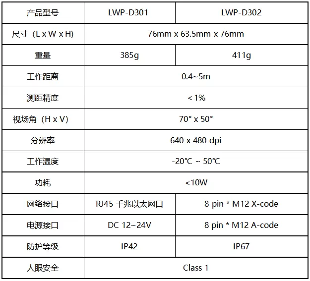 本次洛微科技发布的D3紧凑小巧,集成度高,配备标准千兆以太网工业接口,安装和使用十分方便。产品分有两种型号:LWP-D301和LWP-D302,主要在供电接口、网络接口及防护等级上有所区分。D系列 TOF相机D3均符合工业级防水防尘要求,稳定安全可靠,是实现远距离非接触测量、动态场景的流量计数、3D建模、3D识别等应用的上佳选择,可广泛应用于工业自动化如叉车AGV、物流科技及移动机器人等行业。