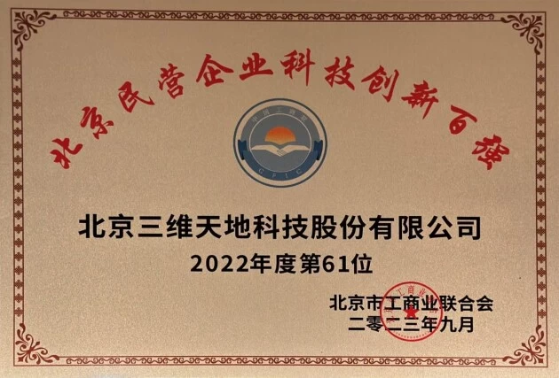 9月21日,由北京市工商业联合会、丰台区人民政府联合举办的2023北京民营企业100强发布会成功召开,正式公布2022年度北京民营企业百强“1+4”榜单。三维天地成功入选年度“北京民营企业科技创新100强”榜单,列居第61位。
