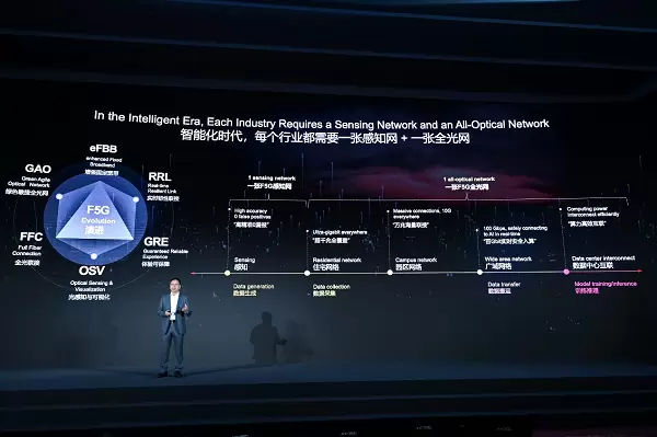 华为光产品线总裁靳玉志在主题演讲中表示:“随着行业智能化的不断深入,行业对感知和联接提出了新的要求,行业智能化需要一张F5G感知网以及一张F5G全光网。在行业智能化演进过程中,华为持续深耕行业感知、全光园区网络、广域生产网、数据中心互联领域、住宅网络,推出系列F5G创新产品及方案,加速AI赋能行业。”