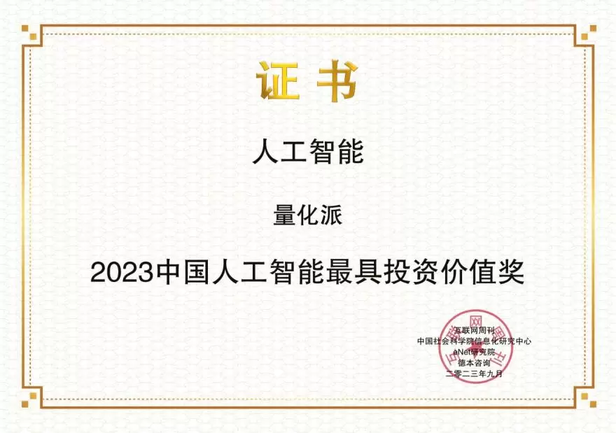 9月20日,《互联网周刊》、中国社会科学院信息化研究中心、eNet研究院、德本咨询联合发布了2023中国新科技100强暨秋季金i 奖名单,量子数科科技有限公司(以下简称“量化派”)荣获2023中国人工智能最具投资价值奖,量化派创始人兼CEO周灏获得2023中国人工智能商业杰出贡献人物奖,成为本届金i 奖人工智能领域的双料王。